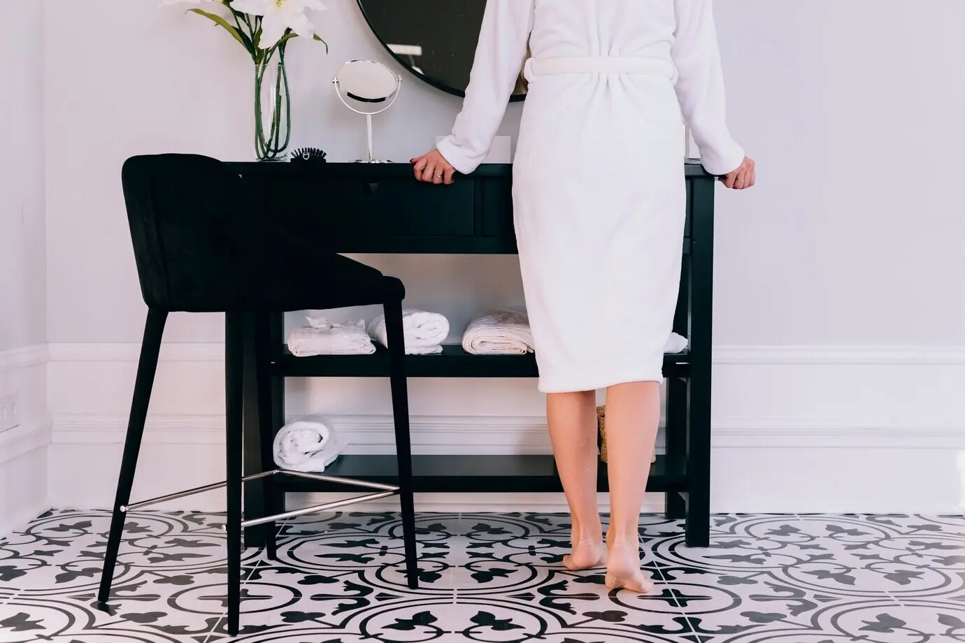 Grundton: weiches Elfenbein, heller Begleiter: Kreideweiß, dunkler Begleiter: Kohle. Materialanker: Leinwand, Keramik in matter Glasur, Akzent: schwarzmattes Metall in feinen Linien. Hier trägt die Komposition von Negativraum und Schatten. Achten Sie auf perfekte Ausführung, denn kleine Ungenauigkeiten fallen stärker auf. Wenige, präzise gesetzte Objekte reichen aus, um den Raum zum kontemplativen, ausgesprochen souveränen Rückzugsort zu erheben.